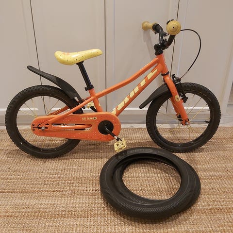 Barne sykkel, noe bruks merker størrelse XS med 16" hjul, unisex-modell. Følger med støtte stang og støttehjul. Passer til sykling på asfalt og lett grus, for eksempel på skolevei, tur og lek.