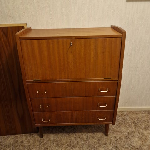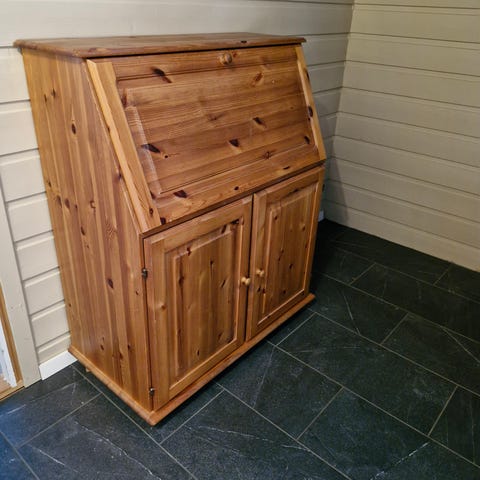 Flott skatoll i furu. Dette kan brukes til skrivebord og det har to skap under til oppbevaring