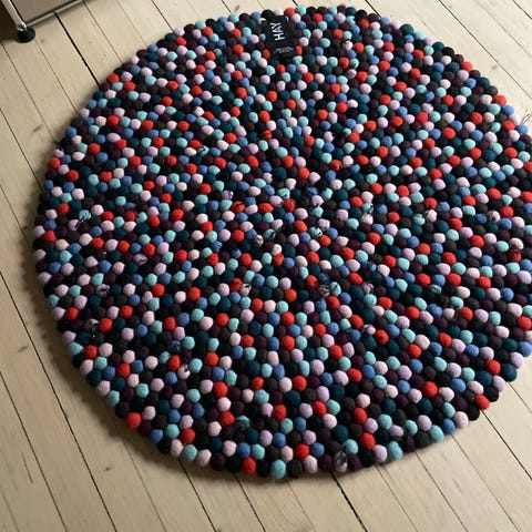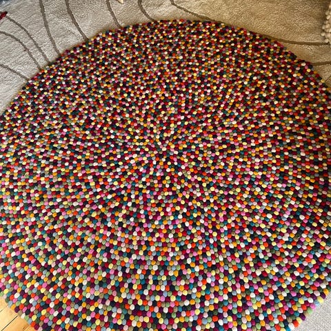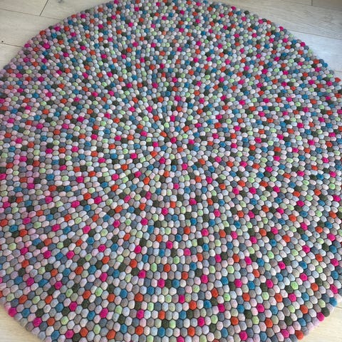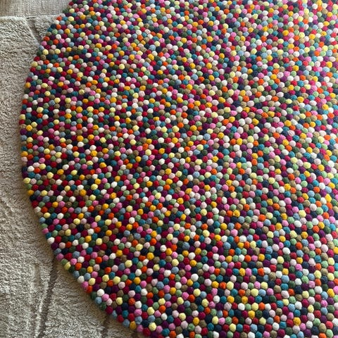 Et livlig og karaktersterkt designteppe laget i 100 % ull, bestående av håndrullede filtkuler i ulike farger. Teppets runde form (Ø90 cm) gjør det perfekt under et lite bord, på barnerom, soverom eller som et fargerikt blikkfang i stue.