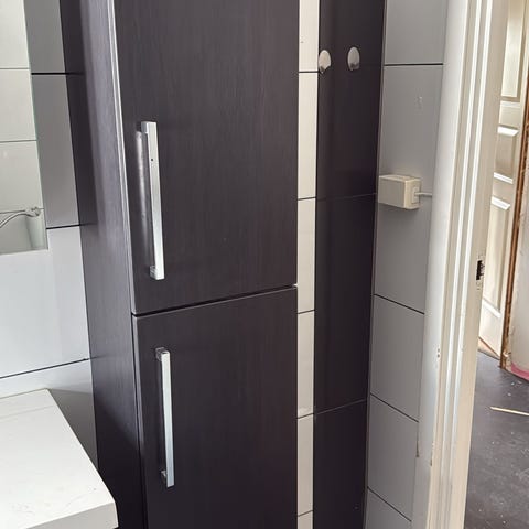 Baderomsinnredning med to høyskap hvit glassfront