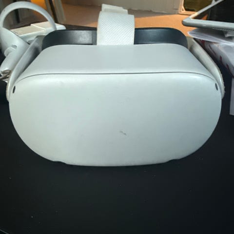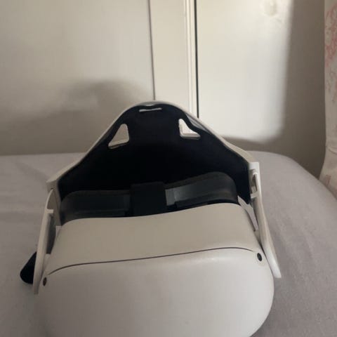 Meta Quest 2 VR-headset veldig fin ikke så mye brukt har brukt den i 1 uke den lader veldig kjapt det tar sirka 1 time for og ha den full lada