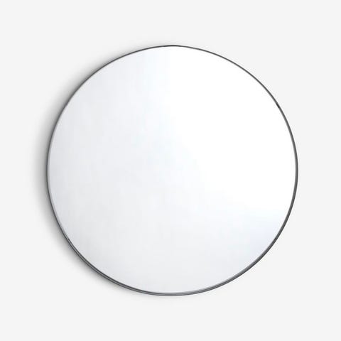 Rundt speil med svart ramme. Speilet har enkel, rund form med tynn ramme i mørk farge som passer inn i ulike rom som gang, soverom eller stue.