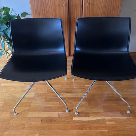 Fine stoler til kontor eller spiseplassen fra Arper. Sjøgrønn farge, ullstoff. Noen små bruksmerker i stole og stoffet er tynnslitt i hjørnene på baksiden. Kan fikses av kyndig person 🤷 ♀️ Selges samlet til 1 000 kroner.