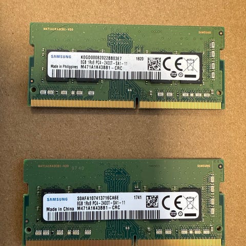 Samsung 8GB 3200MHz sodim brikke. Spesifikasjoner og detaljer finnes på modulens etikett. Passer for kompatible datamaskiner som støtter denne typen RAM.