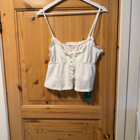 Zara topp i hvit bomull for dame i størrelse S. Modellen har brede stropper og v-utringning med strikket øvre del og knyting foran. Nederste del er vevd bomull med broderte detaljer og hullmønster langs kanten. Toppen er lett og egner seg godt til bruk om våren og sommeren, alene eller over andre plagg.