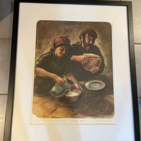 Dett er et øyblikksbilde malt av Morten Müller. Kanskje noe av det fineste med bilde er påskriften bak på maleriet som jeg tolker til ca "Just tid ta male ta lita alv".