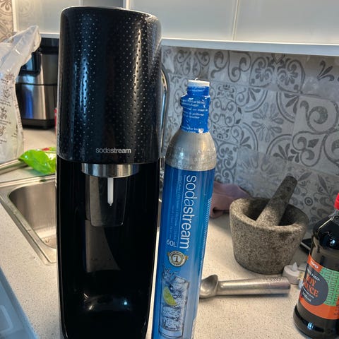 Aqvia kullsyremaskin med flaske og en ekstra ubrukt patron.
