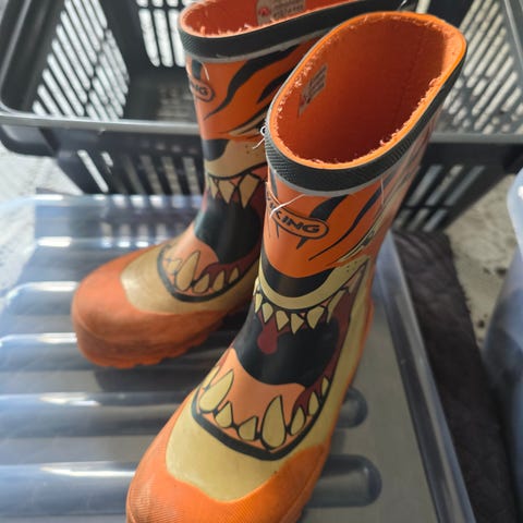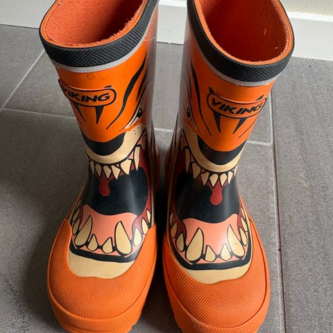 Viking gummistøvler for barn i størrelse 27. Unisex-modell i oransje med motiv. Støvlene er laget i vanntett materiale som passer til bruk på regnværsdager og vått underlag. Grovmønstret såle gir godt grep på ulike underlag. Passer til hverdagsbruk i barnehage, skole og fritid når det er vått ute.