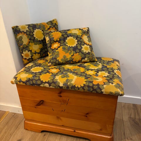 Kiste med lokk som er trukket opp med mulighet til å sitte på.