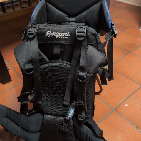 Bergans Juniors Favorite bæremeis i blå og svart. Bæremeisen har polstret rygg og skulderstropper, hoftebelte og flere justeringsmuligheter for bærer. Barnestolen har polstret sete, rygg og sidebeskyttelse, samt sikkerhetssele. Integrert støttebøyle gjør at bæremeisen kan stå støtt på bakken ved inn- og utlasting av barn. Nederst er det en avtakbar eller fastmontert liten sekk/lomme for oppbevaring av utstyr. Egnet til turbruk der barn bæres på ryggen.