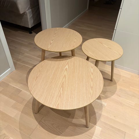 Selger et pent brukt sett med JYSK KALVEHAVE stuebord i natur villeikefarget.