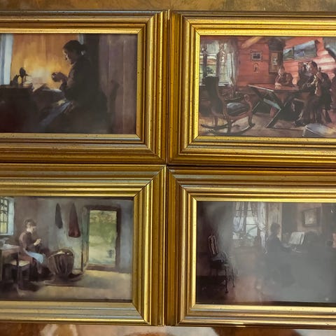Veggbilder sett med landskapsmotiver i brun treramme