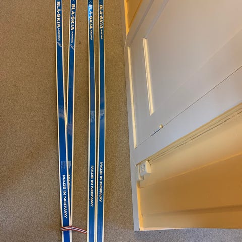 Ski i klassisk modell med hvit og blå overflate og sort såle. Utstyrt med Rottefella-bindinger (NNN-system) montert på skiene. Passer til klassisk langrenn på preparerte løyper.