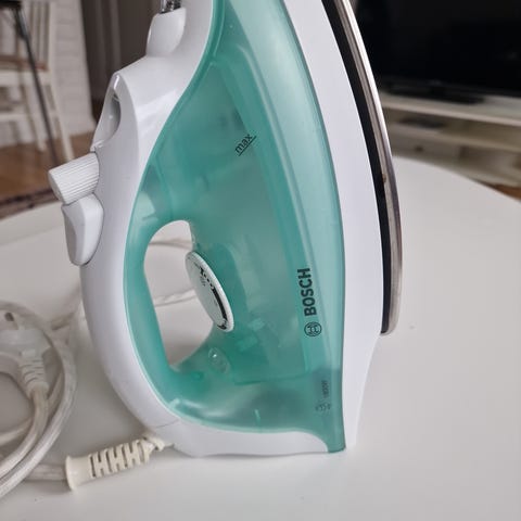 Bosch Secure dampstrykejern i hvit og grå farge. Strøykejernet har dampfunksjon med justerbar dampmengde, sprayfunksjon og temperaturhjul for ulike tekstiltyper. Det har slank spiss for lettere stryking rundt knapper og trange områder, samt glidesåle i metall. Ledning er festet i bakkant av strykejernet. Egnet til vanlig stryking av klær og tekstiler i hjemmet.