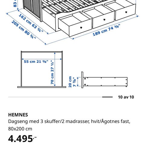IKEA HEMNES dagseng med skuffer i hvit utførelse. Sengen har integrert oppbevaring i form av flere skuffer under liggeflaten, egnet for lagring av sengetøy eller annet tilbehør. Passer som enkeltseng eller dagseng i soverom, gjesterom eller oppholdsrom. Kan utvides til dobbeltseng 160cm. Madrass følger ikke med.