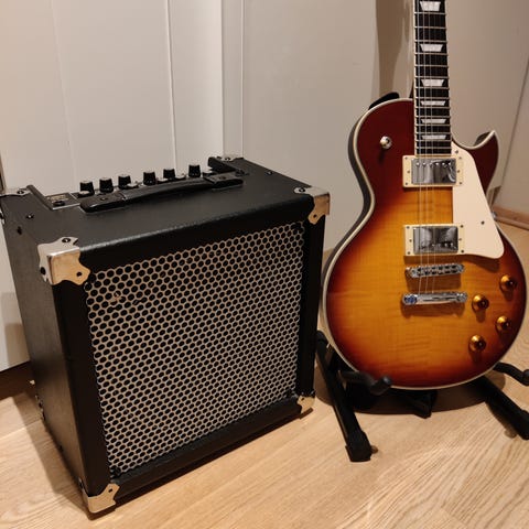 elektrisk gitar i brun finish. Kropp med buet topp og to humbucker-pickuper, volum- og tonekontroll samt 3-veis pickup-bryter. Lønnshals med lyst gripebrett og 6 stemmeskruer på hodet. Leveres sammen med kompakt gitarforsterker med flere kontroller på frontpanelet. Egner seg til øving hjemme og generell elgitarbruk.