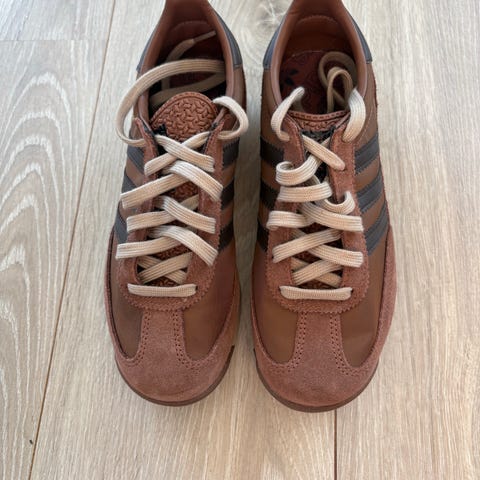 Adidas sneakers/joggesko i størrelse 39. Modellen har overdel i lilla materiale med de karakteristiske hvite Adidas-stripene på sidene og hvit detalj på hælen. Yttersålen er i gummi med mønster for godt grep. Lukkes med lisser. Egnet som fritids- og hverdagsko.