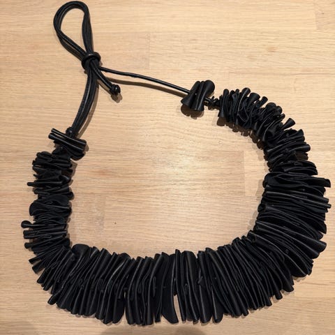 H&M smykke for dame i lær. Smykket består av flere rader med runde, svarte elementer festet til en lenke med regulerbar kjede og lukking bak. Materialet er lær, og designet gir et markert og lagdelt uttrykk. Passer til bruk alene som et statement-smykke til ulike antrekk.