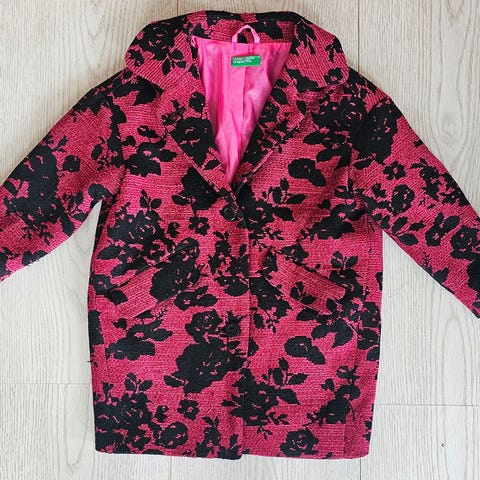 Kåpen har et klassisk leopardmønster i en myk og luksuriøs finish. Den har elegante detaljer som sort fløyelskrage og lommer, samt et nydelig knallrosa satengfôr som gjør kåpen like fin inni som utenpå.