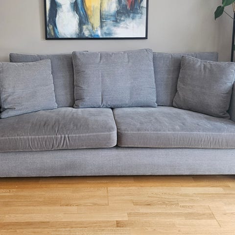 Godt brukt sofa selges billig. Selges som den er med enkelte bruksmerker som vist på bilder. Trekk kan tas av og vaskes. Må hentes i 5. etasje.