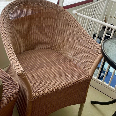 Kurvstol i rotting i brun farge. Stolen har buet rygg og armlener i ett, med tett flettet sete og klassisk kurvdesign. Egner seg til bruk på balkong, terrasse, vinterhage eller innendørs sittegruppe.