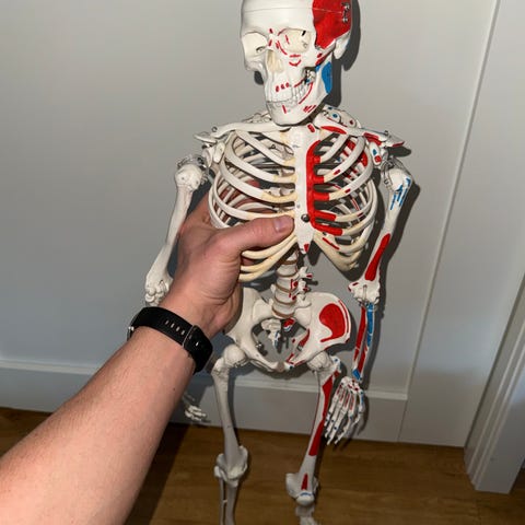 Anatomisk menneskemodell som viser muskler, skjelett og indre organer. Modellen står på fotplate og er i helfigur med utstrakt arm. Flere deler kan tas av for å vise underliggende strukturer, blant annet brystkasse og organer i bryst- og bukhule. Egnet som undervisnings- og demonstrasjonsmodell i anatomi for skole, helsefag og medisinsk opplæring.