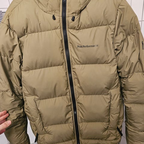 Peak Performance dun vinterjakke for herre i størrelse M. Jakken er oransje og fylt med dun, noe som gir god isolasjon på kalde dager. Modellen har hette og gjennomgående glidelås foran. Yttermaterialet er glatt og slitesterkt, og jakken har klassisk Peak Performance-logo på brystet. Passer til hverdagsbruk og utendørsaktiviteter i vinterhalvåret.