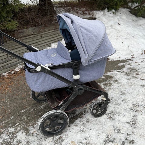 Cybex Priam barnevogn i grå tekstil. Vognen har vendbar sportsdel med justerbar rygg og fempunktssele, og meget pent brukt liggedel. Frontbøyle og håndtak er i sort materiale. Understellet har fire hjul og romslig varekurv under setet. Egnet til bruk fra spedbarn med liggedel eller bilstol (ikke inkludert) og videre som sportsvogn for større barn. Det følger med to gode regntrekk.