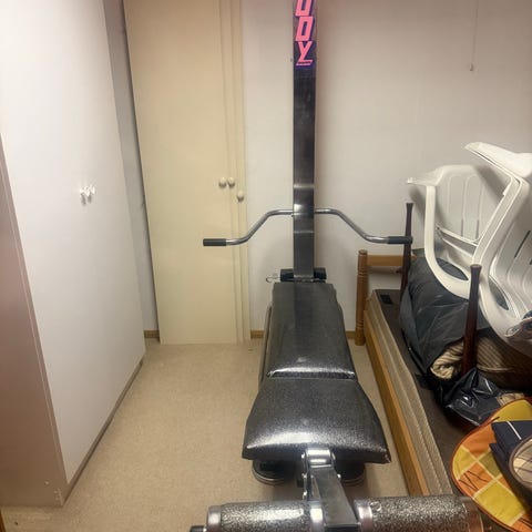 Mageapparat med polstret sete og metallramme med buede skinner og håndtak foran. Setet er justerbart langs skinnene, og ryggstøtten er polstret for støtte under øvelser. Egnet for trening av de rette og skrå magemusklene i hjemmegym eller treningsrom.