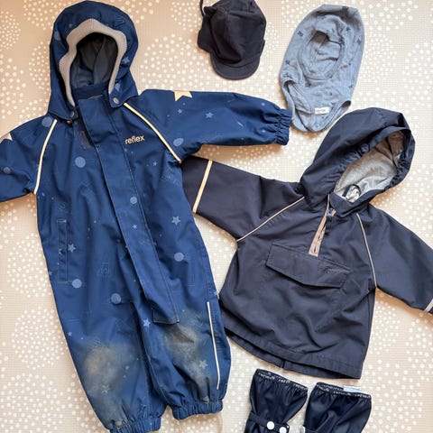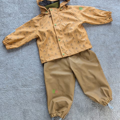 Pent brukt todelt regnsett fra Kattnakken str 80. Slenger med noen lite brukte støvler fra Reflex i pakken (hvis du vil ha) str 22