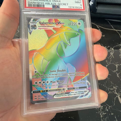Pokémon Salamence EX spesial illustrasjonskort, engelskspråklig utgave fra 2023 Pokémon JTC. Kortet er innkapslet og gradert av PSA med karakteren Mint 9. Motivet viser Salamence EX med illustrasjon over hele kortflaten. Dette er et samlekort egnet for oppbevaring i samling eller som del av et Pokémon TCG-deck, avhengig av spillformat og regler. PSA-innkapslingen beskytter kortet mot slitasje og gjør det enklere å håndtere og oppbevare i samling.