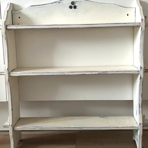 Hylle i heltre med dekorative treskjæringer. Utskårne detaljer gir et tradisjonelt preg. Overflaten fremstår ubehandlet eller lett behandlet, slik at den kan oljes, beises eller males etter ønske. Vintage, retro.