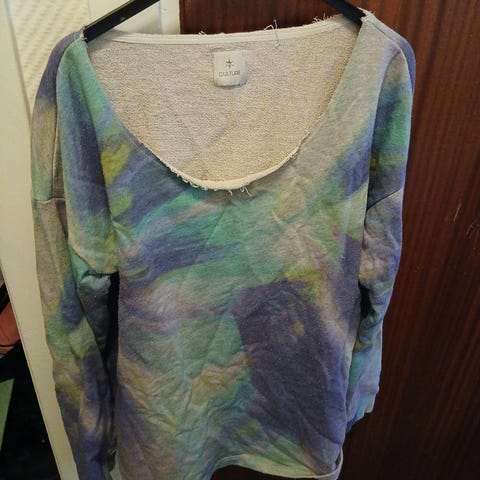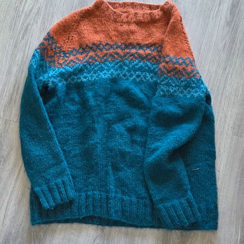 Kjøpt på Finn. Lite brukt, den har et hull foran nede, kan helt sikkert fikses men det blir ikke gjort av meg…. Fine farger, romslig og mykt garn som ikke klør!