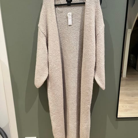 Lindex cardigan for dame i størrelse M. Lang, åpen modell uten knapper i grå farge. Strikket i polyesterblanding med myk, lodden overflate. Egnet som et ekstra lag over topper, skjorter eller kjoler til hverdagsbruk eller på kjølige dager.
