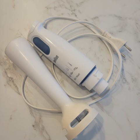Stavmiksersett med forskjellige beholdere og kuttere. Selve stavmiksermotoren sluttet å fungere, så den følger ikke med. Men dersom noen har mikser fra Braun er dette et godt tilbehørsett som dekker flere behov. Den store beholderen tar ca 1,5L, og den lille tar nok litt under 0,4L.