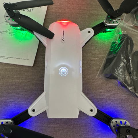 Drove sammenleggbar drone i hvit farge med fjernkontroll. Dronen har fire propeller med sammenleggbare armer for enklere oppbevaring og transport. Settet inkluderer fjernkontroll, USB-ladekabel, ekstra propeller og bruksanvisning (engelsk) merket «Collapsible aircraft». Egnet for enkel flyging og grunnleggende bruk utendørs på rolige dager, samt innendørs der det er god plass. Krever batterier til fjernkontrollen og opplading av dronen via medfølgende kabel.