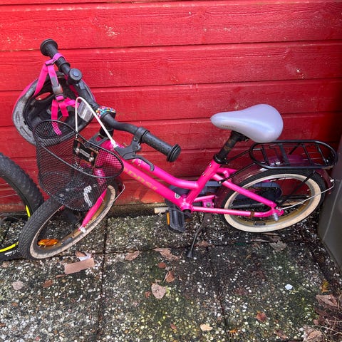 White barnesykkel med 16" hjul i turkis og hvit farge med rosa detaljer. Sykkelen har kurv foran, bagasjebrett bak, heldekkende kjedekasse og skjermer. Egnet som barnesykkel i overgangen fra mindre til større hjulstørrelse, for bruk på asfalt og lett grus. Noe bruksslitasje og litt rust. Fint brukt.