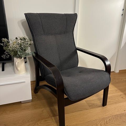 Flott og komfortabel lenestol i stilrent design selges. Stolen har god sittekomfort og solid konstruksjon med mørke trearmlener og grått, slitesterkt tekstiltrekk.