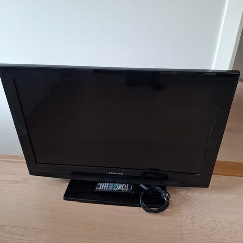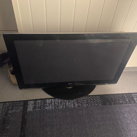 LG TV i svart farge. Modellen har bordstativ og relativt tykk ramme og bakside, typisk for eldre flatskjermer. Ca 55 tommer. Det hender at bilde «henger seg opp» en gang i blant.