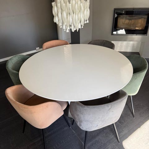 Selger et stilrent og moderne rundt spisebord (Ø 138 cm) med 6 nydelige stoler i lys grå velour.