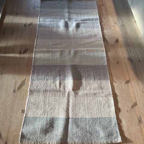 2 IKEA pent brukte tepper / løpere i 100 % ull med stripemønster i flere varme naturfarger: beige, brunt og blått. (Stockholm?) 0,8 m x 1,5 m.