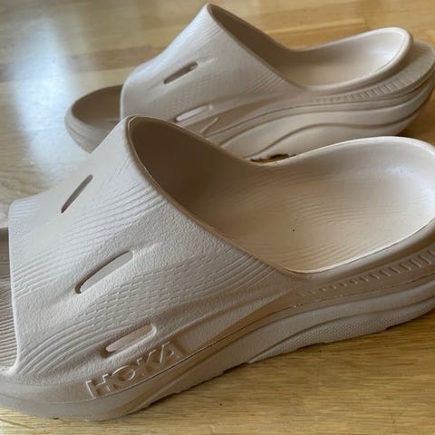 Helt ny Hoka Ora Recovery Slide 3 sandaler i størrelse 36. Modellen er en åpen slip-on sandal med bred passform og støtdempende mellomsåle i skum. Fargen er hvit. Sandalene har strukturert såle for bedre grep og ventilasjonsåpninger på oversiden. Egnet som recovery-sandal etter aktivitet eller som lette hverdagssandaler.