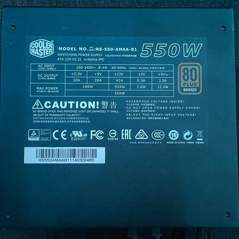 Cooler Master MWE Gold 550 strømforsyning med effekt på 550 W. Enheten er svart og har 120 mm vifte på toppen. Strømforsyningen er 80 Plus Gold-sertifisert, noe som innebærer høy energieffektivitet ved ulike belastninger.
