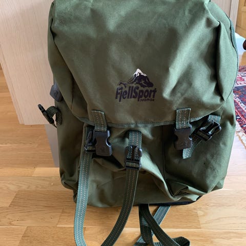 Fin jaktsekk i vadmel. Følger med to avtagbar sidelommer. Ene sidelommen har noen små hull. Se bilder. Selve sekken er i fin stand innvendig og utvendig. Følger med magebelte. Ved bryststropp så mangler ho delen. Så bilder. Kjøper betaler frakt