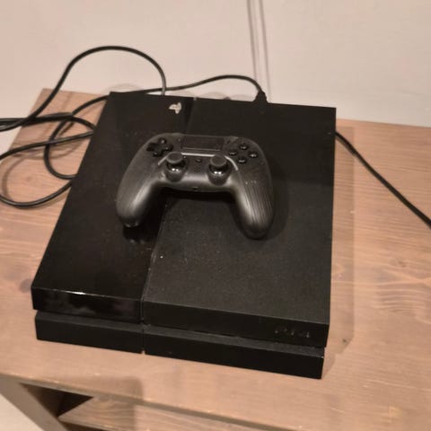 Sony Playstation 4 spillkonsoll i svart farge. Konsollen er beregnet for bruk med PlayStation 4-spill og støtter tilkobling til TV eller skjerm via HDMI. Egnet for spilling, mediemultimedia og nettbaserte tjenester som støttes av Playstation 4-plattformen. 2 kontroller medfølger.