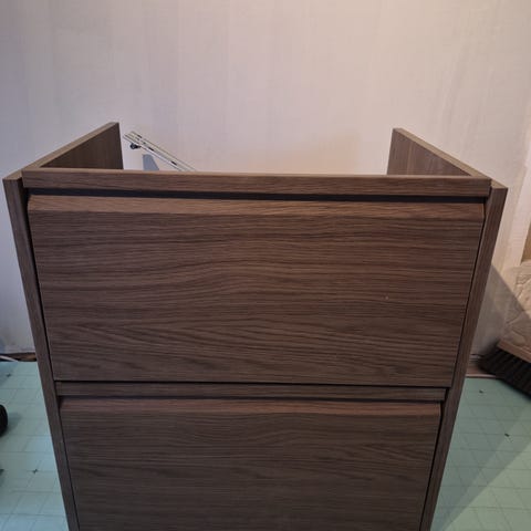 Helt nytt. Selges pga feil størrelse. Eikemønstret skap som er montert. Servanten er uten blandebatteri og vannlås. Nypris Kr 4.600