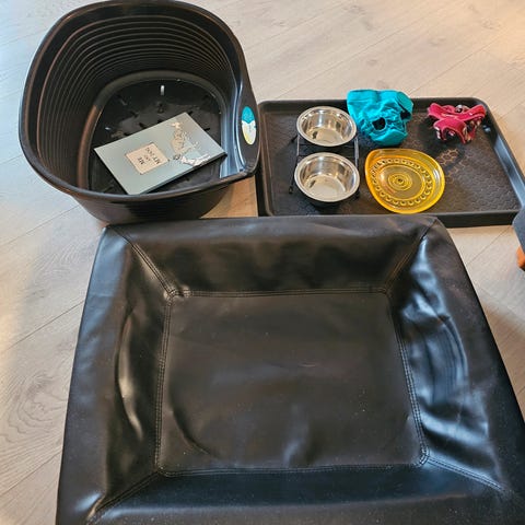 Litt forskjellig til ein liten mellomstor hund. Seng, brukt til bilen, bildene på korte turer, sele for tur i skog og mark, stellebord, vanlig fast bånd, matskål for reise og for stasjonært og børste. Det står ute i boden klar til henting.