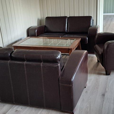 Selger en skinnsofa, 2 recliners og 1 bord helst samlet. Behagelig å sitte i. Ryggen i sofaen er delt opp i 3 deler, som kan legges bakover for mer comfort.