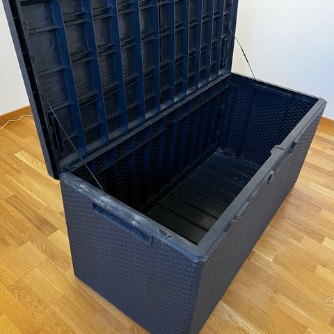 Putekassen har lokk med hengsler og innvendig plastforing. Yttersiden er i flettet kunstrotting som er egnet for utendørs bruk på terrasse, balkong eller hage. Kassen har feste for hengelås foran. Egner seg til oppbevaring av puter, tepper eller annet utstyr som skal beskyttes mot vær og vind.