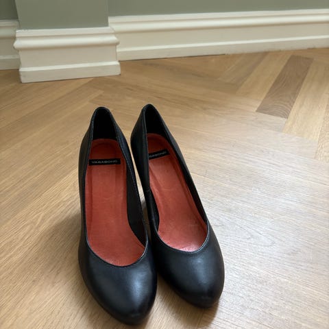 Vagabond hæler i størrelse 38. Skoene er i svart skinn med spiss tå og lav, smal hæl. Modellen har flere remmer over vristen med små metallspenner som detalj. Glatt såle med merkets logo under. Passer til bruk ved formelle anledninger, jobb eller hverdag der man ønsker en klassisk, lav hæl.